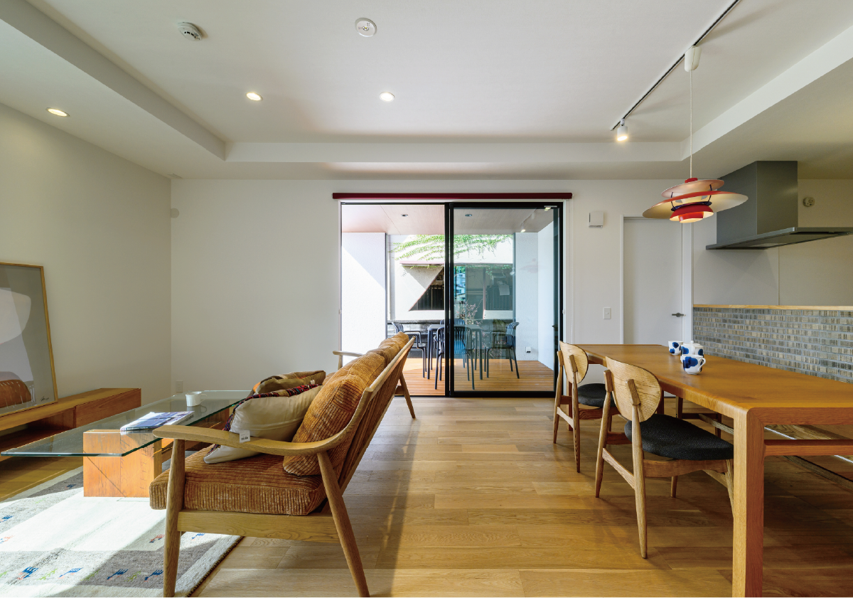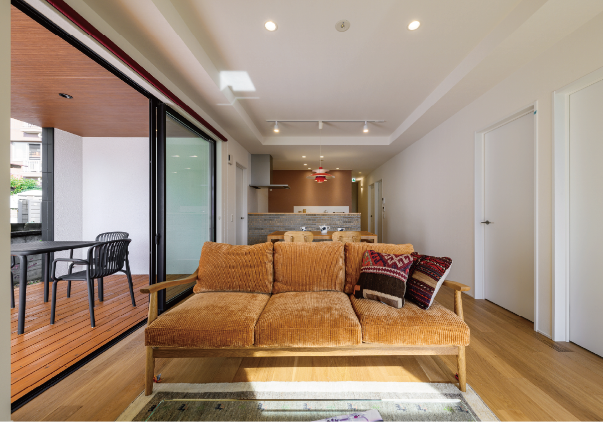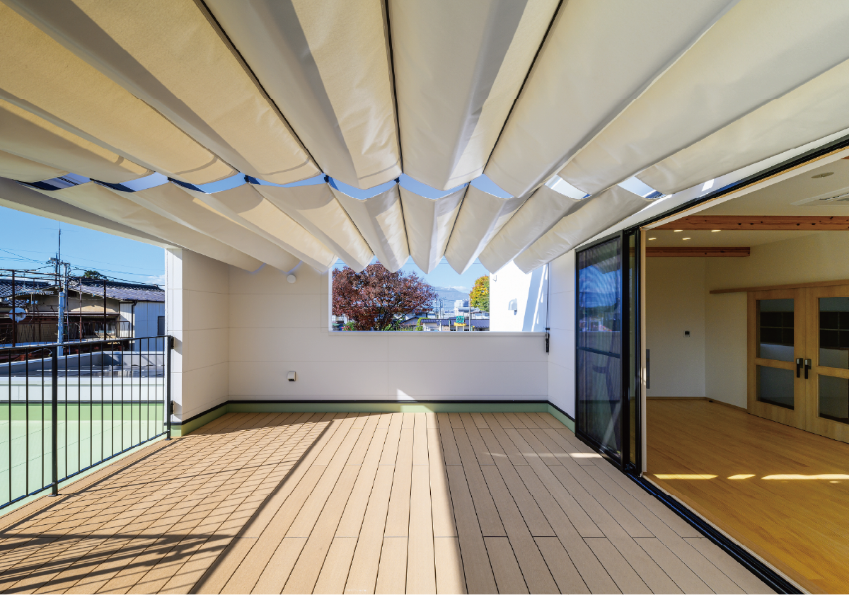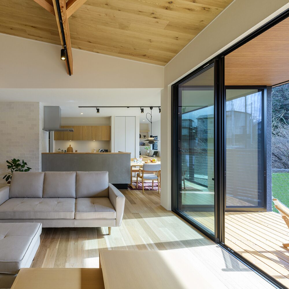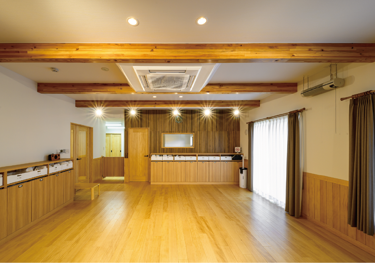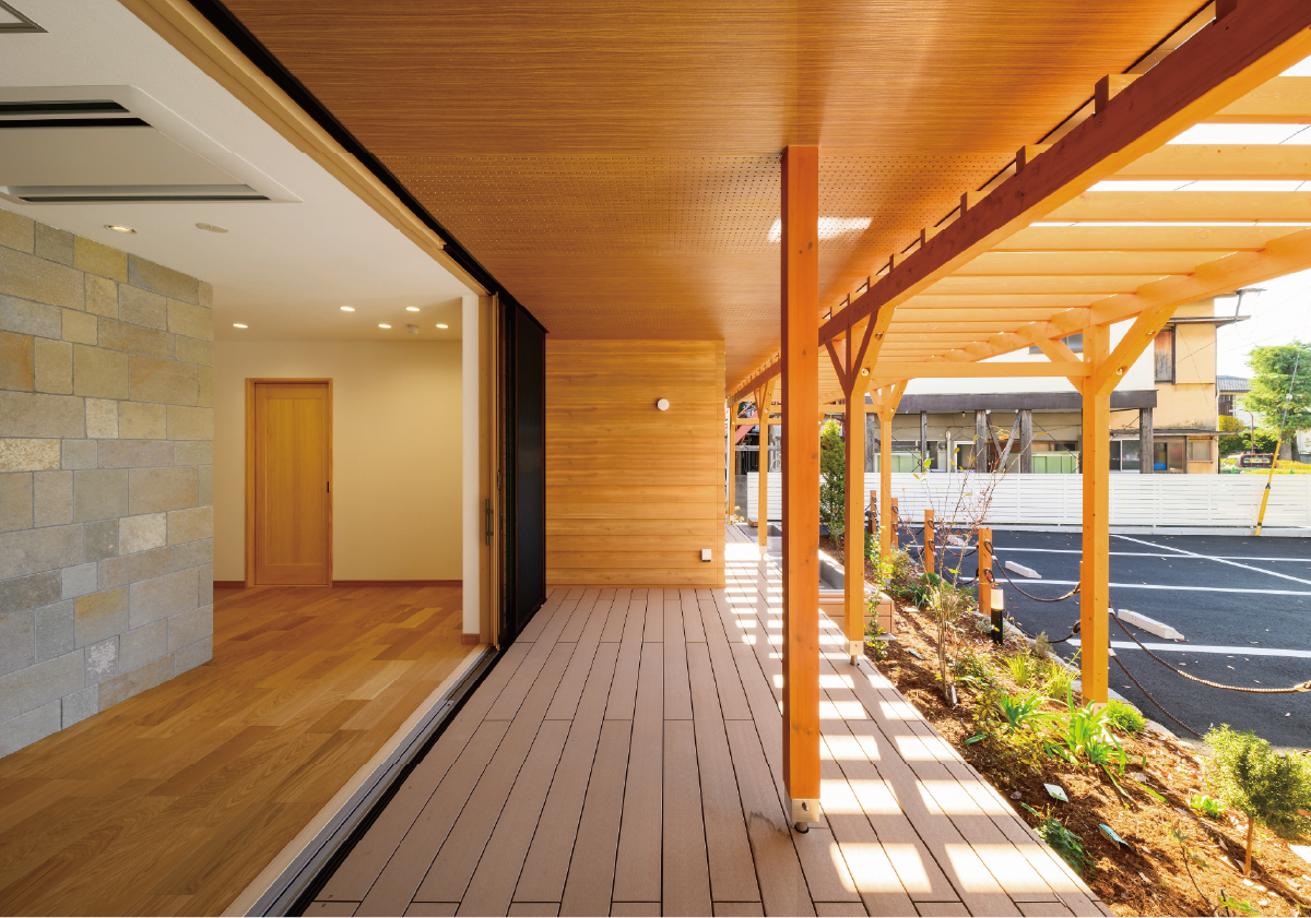 甲府駅にほど近い位置に建つ、障害を持つ女性の為のグループホームです。オーナー様は、障害を持つ方でも機能的なだけの施設、という場所でなく暮らしの中で心が豊かになるような空間、設えが必要であるという信念を持っておられました。そこで、入居者の方が集まるメインのリビングスペースから大きな開口を通して屋根付きのアウトドアリビングに気軽に出て、過ごせるようなプランをご提案し、毎日の暮らしの「心地好さ」を生み出すホームが完成しました。