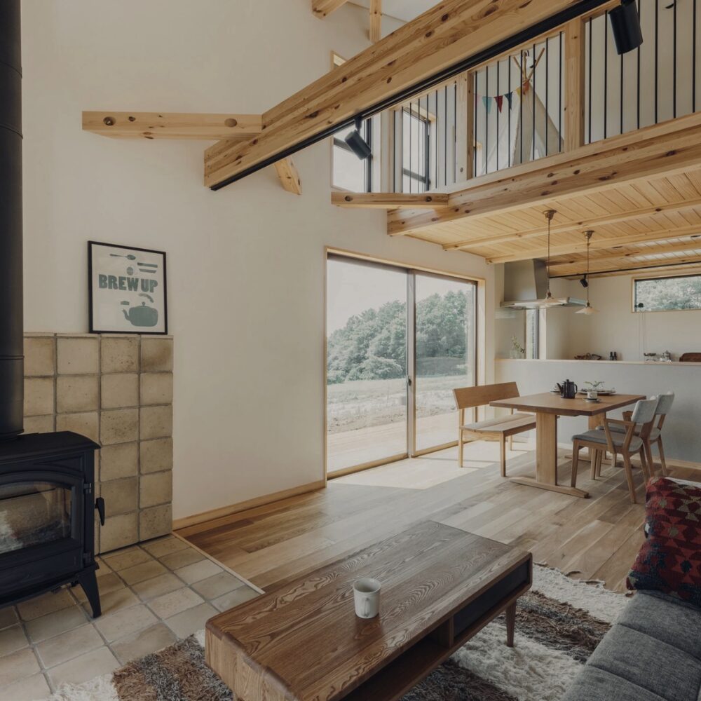 富士吉田で人気の月江寺駅近くの平屋一棟貸しの宿泊施設です。フレキシブルに利用できる土間空間と大屋根のロフトスペースが開放感を生み出します。